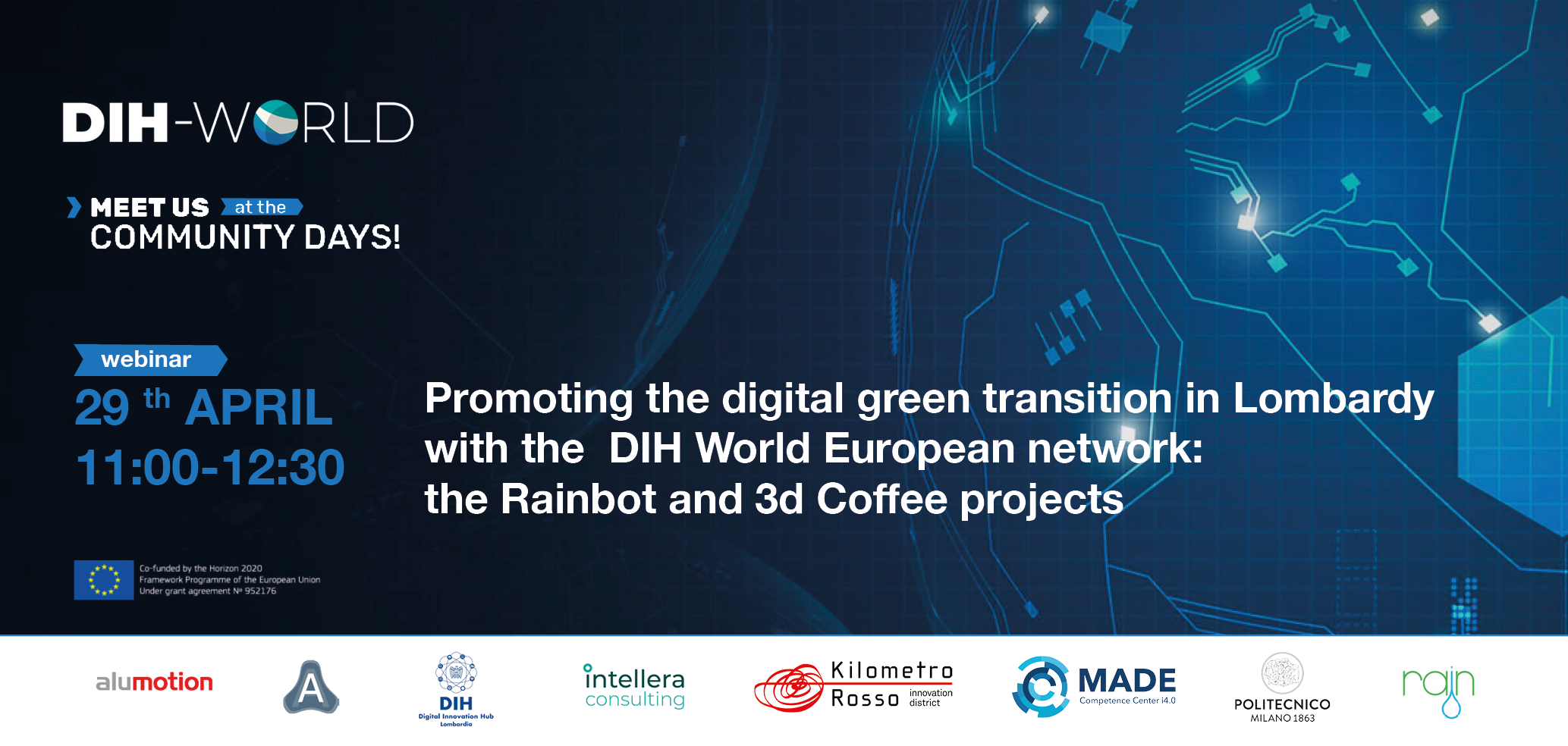 Il 29 aprile partecipa al DIH World community day in cui verrà presentata un'overview del Network europeo DIH World, illustrata l'importanza di una trasformazione digitale sempre più Green e verranno descritti i progetti RainBOT e 3D coffee.