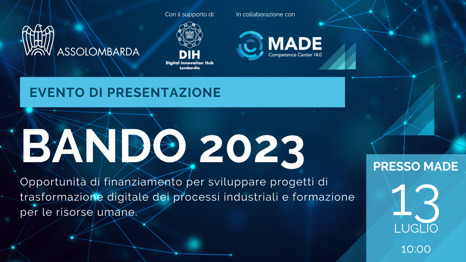 Il prossimo 13 luglio alle ore 10.00 Assolombarda con il supporto di DIH Lombardia organizza un evento di presentazione dei finanziamenti messi a disposizione da MADE Competence Center presso il MADE Competence Center.
